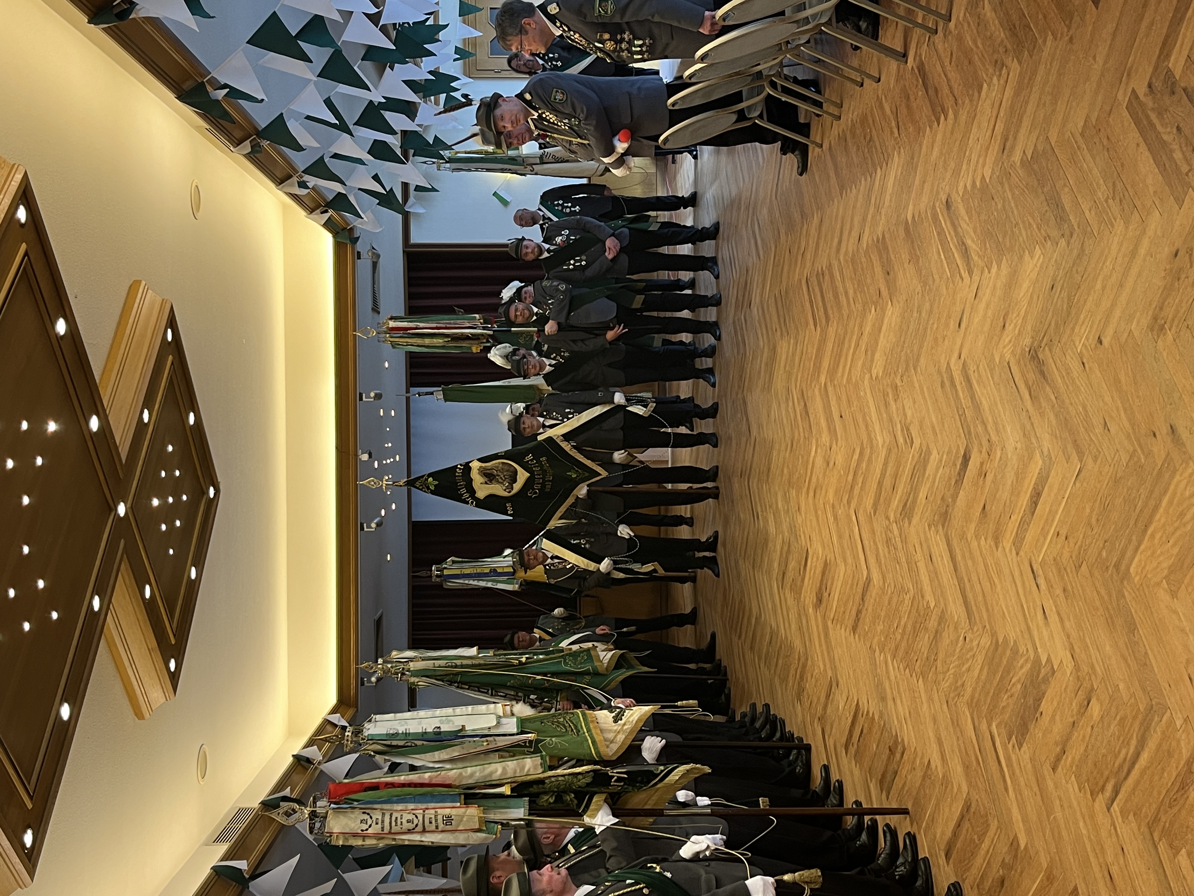 Nachdem Präsident Thomas Meyer und Vizepräsident Jörg Fischer einen (humorvollen) Abriss über die bisherigen Fahnen bzw. die Beschaffung der neuen Fahne vorgetragen haben, marschierten alle Fahnenabteilungen gemeinsam auf den geschmückten Saal unseres Vereinswirtes Klindworths Gasthof.